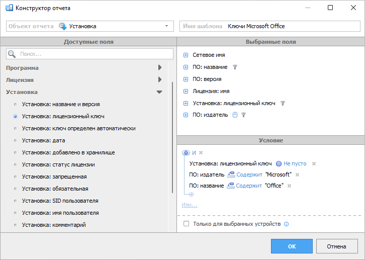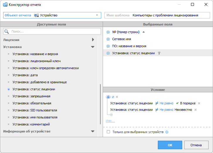 В ситуациях, когда предустановленные шаблоны не соответствуют специфическим требованиям, Total Network Inventory предлагает специальный конструктор отчетов. Этот инструмент управления лицензиями позволяет создавать персонализированные отчеты, выбирая необходимые условия в соответствии с конкретными критериями. Кроме того, часто используемые отчеты могут быть закреплены в верхней части списка шаблонов для быстрого доступа.