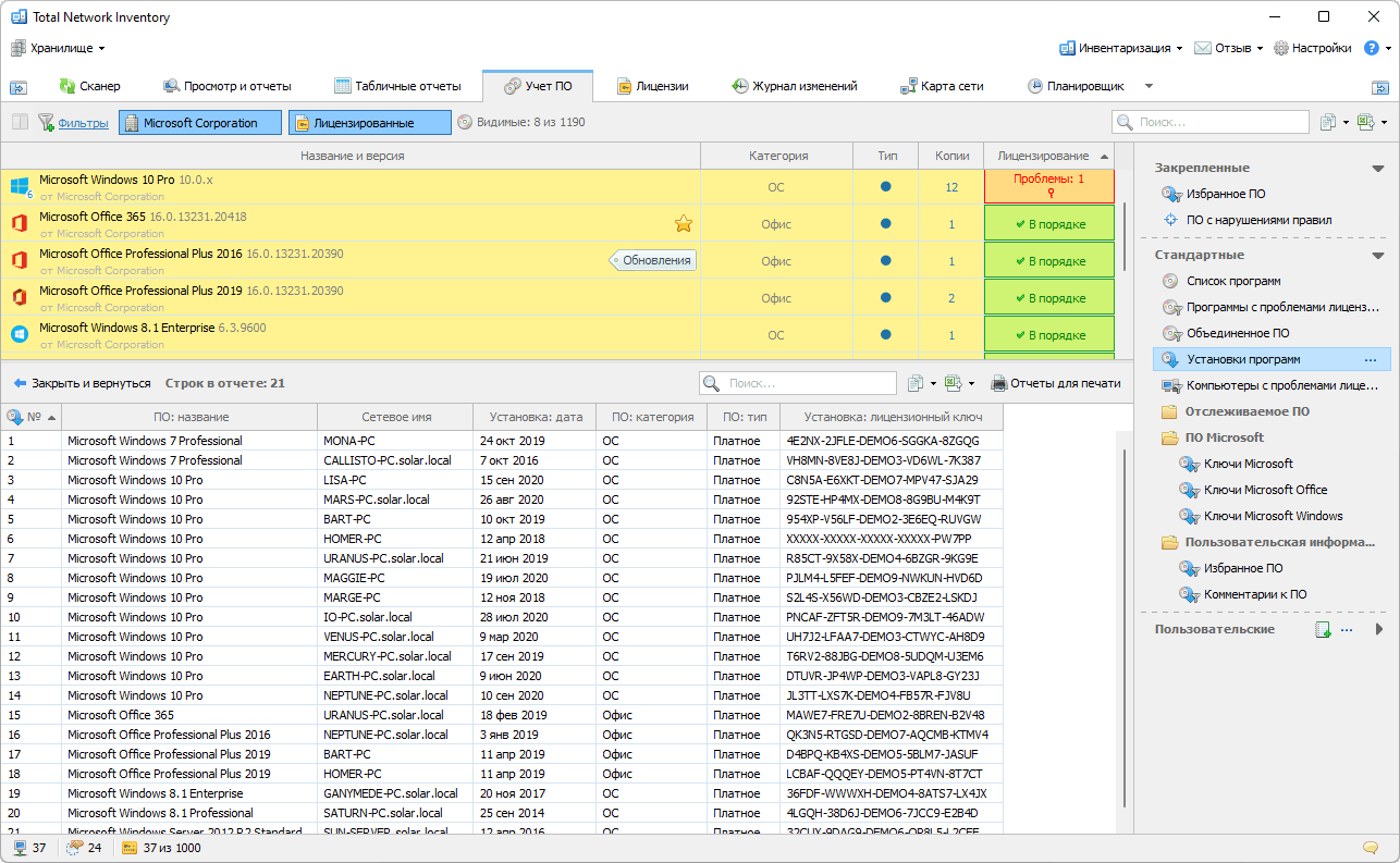 Total Network Inventory Professional предоставляет доступ к детализированным отчетам из модуля управления лицензиями, предлагая множество предустановленных шаблонов, которые позволяют получать данные в табличном формате всего за пару кликов. Необходим список неавторизованного программного обеспечения или обнаруженные ключи активации? Соответствующий отчет всегда под рукой!