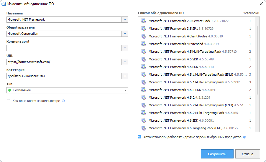 Платформа упрощает управление программным обеспечением, позволяя объединять различные версии одного и того же приложения. Это можно сделать вручную или с помощью автоматизации, в зависимости от предпочтений пользователя. Возможность консолидации версий помогает поддерживать четкий и актуальный список установленного ПО, облегчая управление лицензиями и обеспечение соблюдения требований.