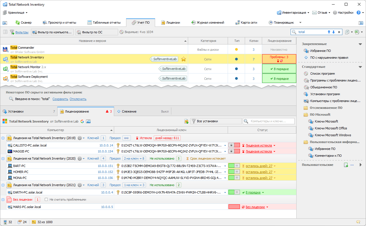 Критическим аспектом управления ИТ-активами является поддержание актуального списка ПО в сети и его лицензионного статуса. Total Network Inventory Professional превосходен в этой области, предоставляя информацию в реальном времени о том, какие приложения лицензированы, а какие нет. Он включает автоматическую работу с кодами активации для широко используемых программ, предлагая различные отчеты и нотификации о лицензионных несоответствиях, позволяя оперативно решать вопросы соответствия лицензионным требованиям.