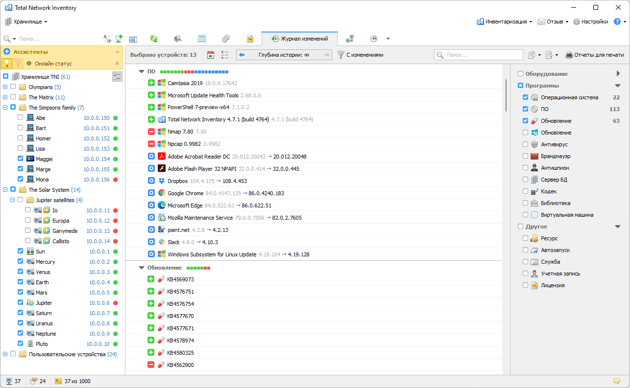 Total Network Inventory Professional включает ряд дополнительных функций, предназначенных для оптимизации управления ИТ-активами. К ним относятся инструменты для мониторинга присутствия программного обеспечения на конкретном оборудовании, ручного или автоматического объединения различных версий идентичных приложений, и уточнения результатов поиска с помощью регулярных выражений. Платформа также предоставляет быстрый доступ к информации о любом приложении через прямые ссылки на поиск в Google или сайт разработчика.