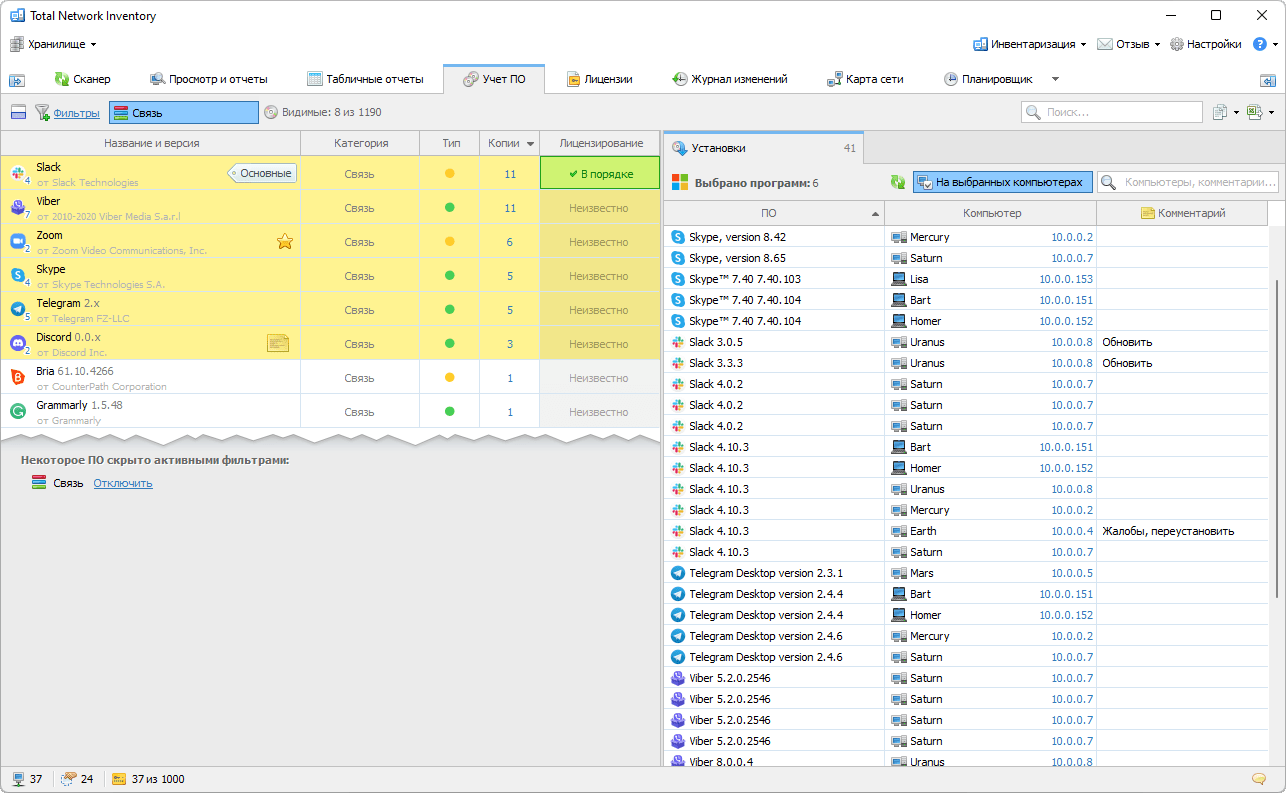 Total Network Inventory Professional поможет моментально узнать, на каких компьютерах установлены те или иные программы, позволяя легко определять установки запрещенного корпоративными правилами ПО в сети.