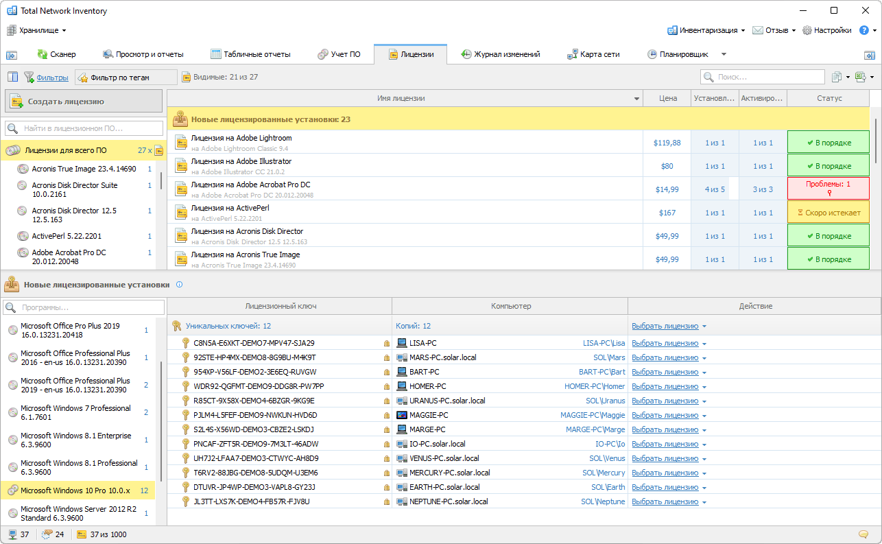 Total Network Inventory предлагает надежные инструменты для управления комплексной инвентаризацией лицензий. Программа позволяет детально записывать все лицензии, включая их атрибуты, коды активации, сроки действия и затраты. Кроме того, приложение облегчает организацию всех сопутствующих документов, таких как квитанции и лицензионные соглашения конечного пользователя (EULA), обеспечивая легкий доступ ко всей лицензионной информации и её тщательное документирование в системе управления инвентаризацией ПО.