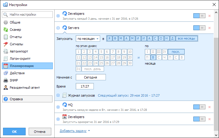 С помощью Total Network Inventory вы можете запланировать проведение аудита ПО. Вы можете выбрать день и время для запуска отдельной задачи учёта или запланировать выполнение данных задач на постоянной основе. Проводя учёт в непиковые часы с помощью планировщика программы, вы можете быть уверены, что проверка не помешает работе сотрудников.